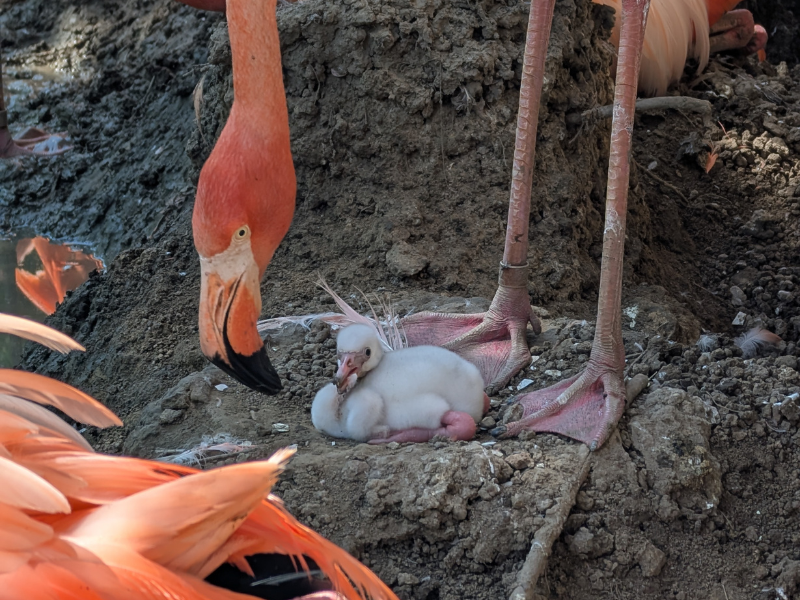 In an exciting milestone three decades in the making, our Bird crew welcomed American flamingo chicks for the first time in 30 years! The last flamingo chick to hatch at our Zoo was in 1988. This incredible accomplishment was made possible by our animal care team’s direct collaboration with the horticulture team to recreate an ideal nest building area where the birds could build their mud nests, lay, and hatch the eggs. So far, we have welcomed three chicks, and we eagerly anticipate the hatching of two more eggs over the coming weeks. All parents are currently providing excellent care to their chicks, who stay in the nest for the first few weeks. At about three months, the rapidly growing and well-fed chicks will match the size of their parents, but will not develop the iconic pink feathering until next season. This successful effort highlights some of the best characteristics our team, in displaying their commitment to care, innovation, and collaboration. Great work, Bird crew!